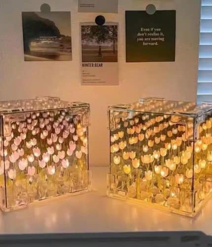 Artificial Tulips in Crystal Box (Square) – Handmade LED Flower Night Light